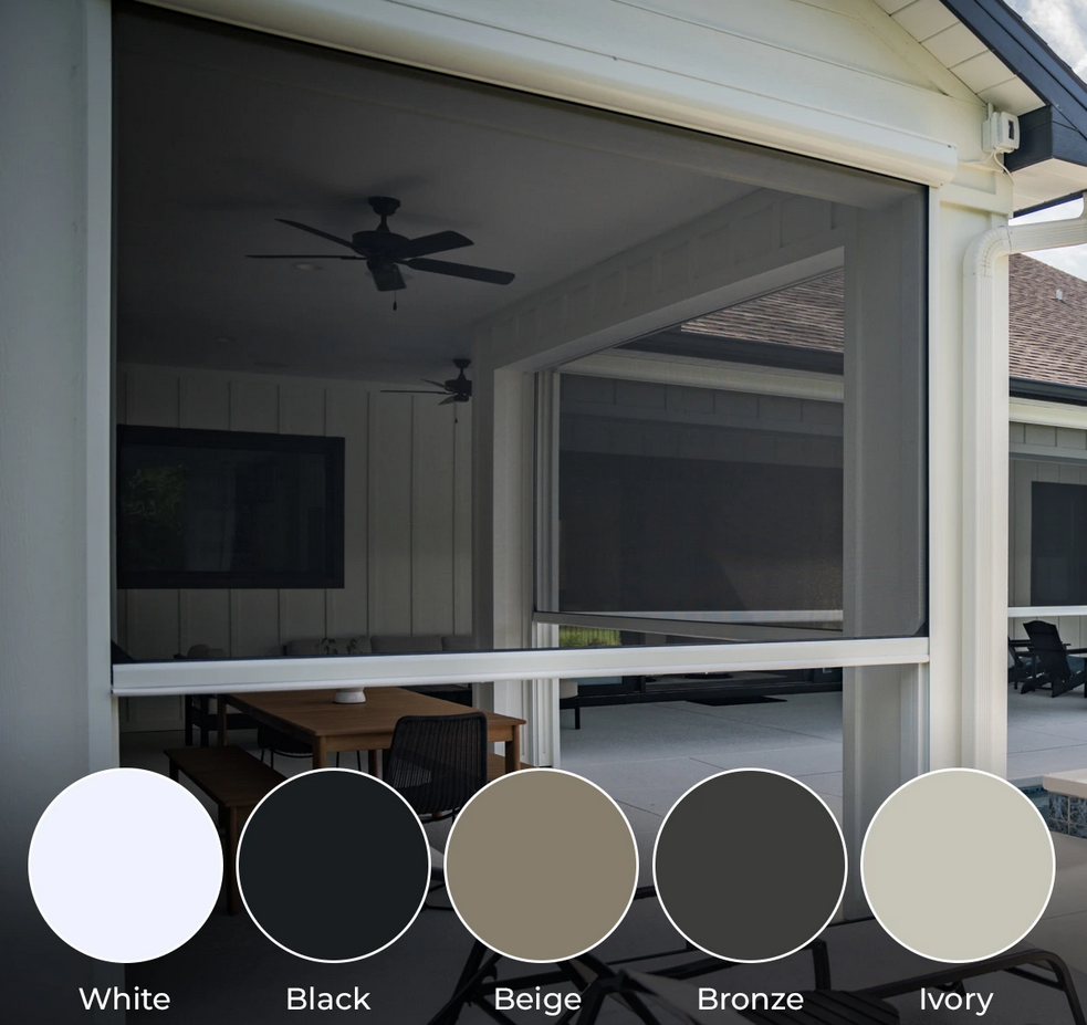 All fabrics are sourced from Phifer® and Twitchell®, brands that have been making outdoor screen materials for decades. Choose from solar-control mesh, insect screen, or blackout privacy fabric depending on how much light, airflow, and privacy you want. Every option is certified resistant to bacteria, mold, and mildew, a real plus on those humid desert evenings.